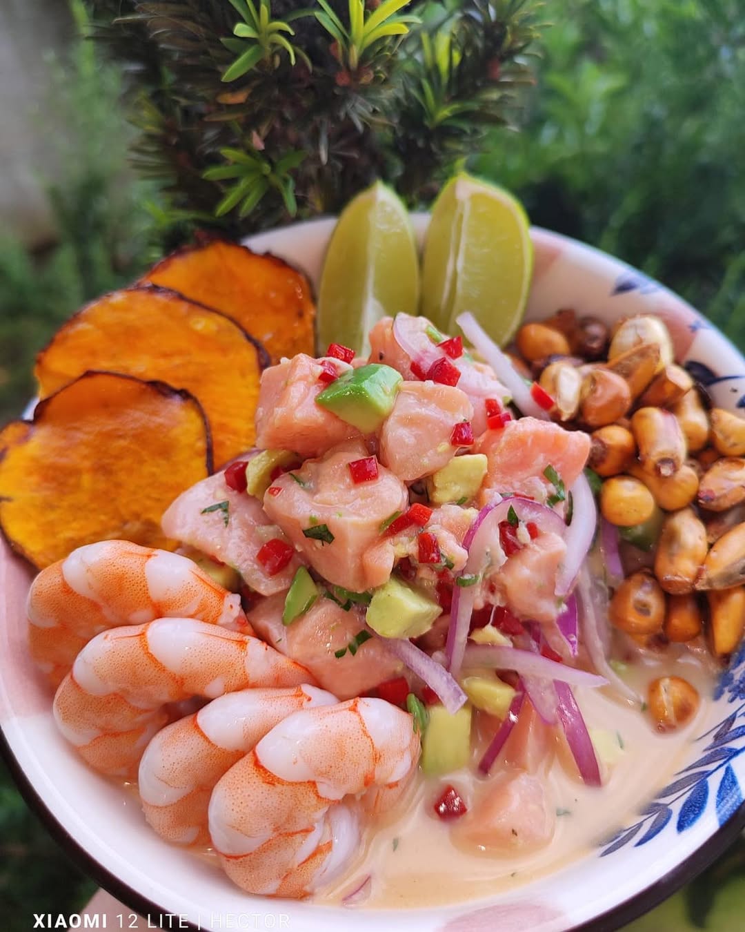 Exquisito ceviche de salmón de la zona, acompañado de vegetales de nuestro huerto.